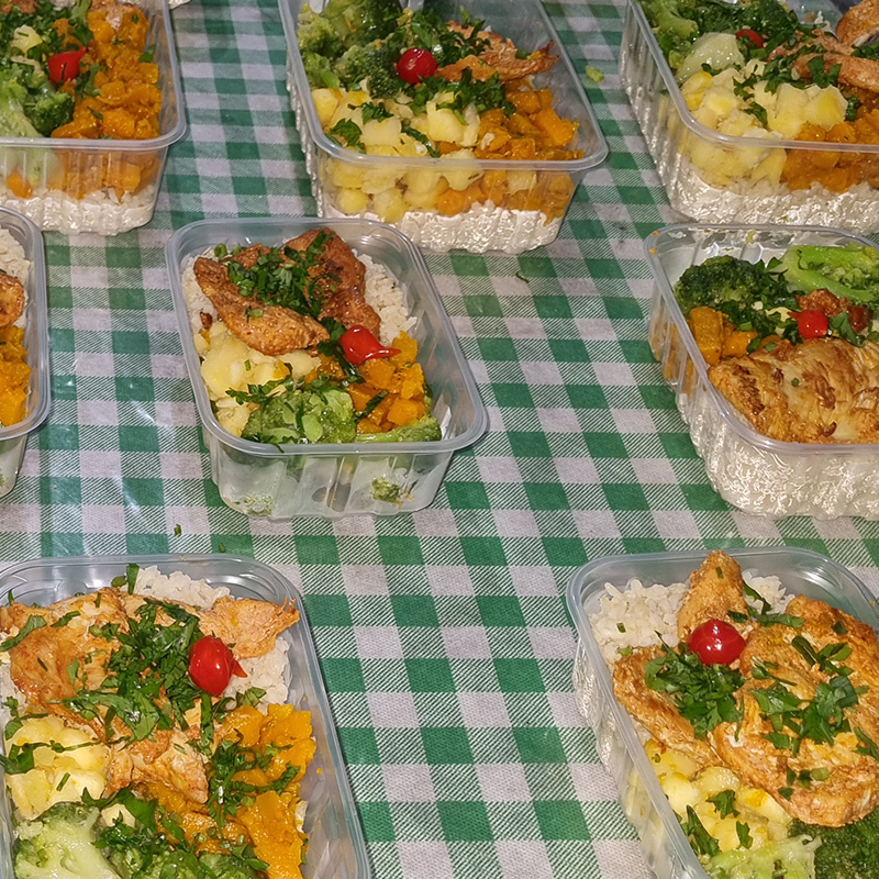 Filé de frango, arroz integral, dueto de legumes, feijão